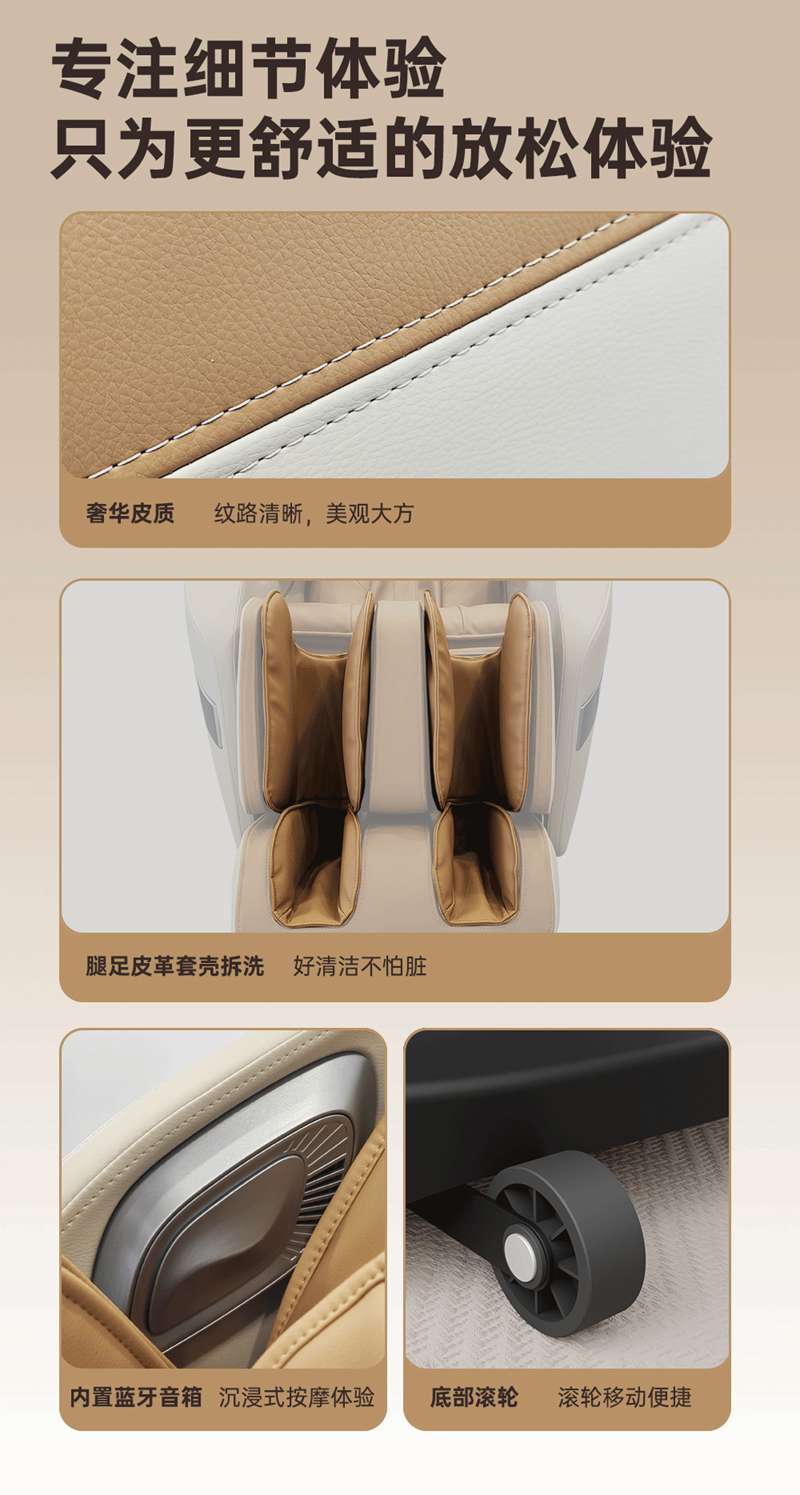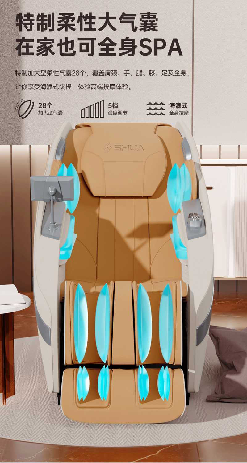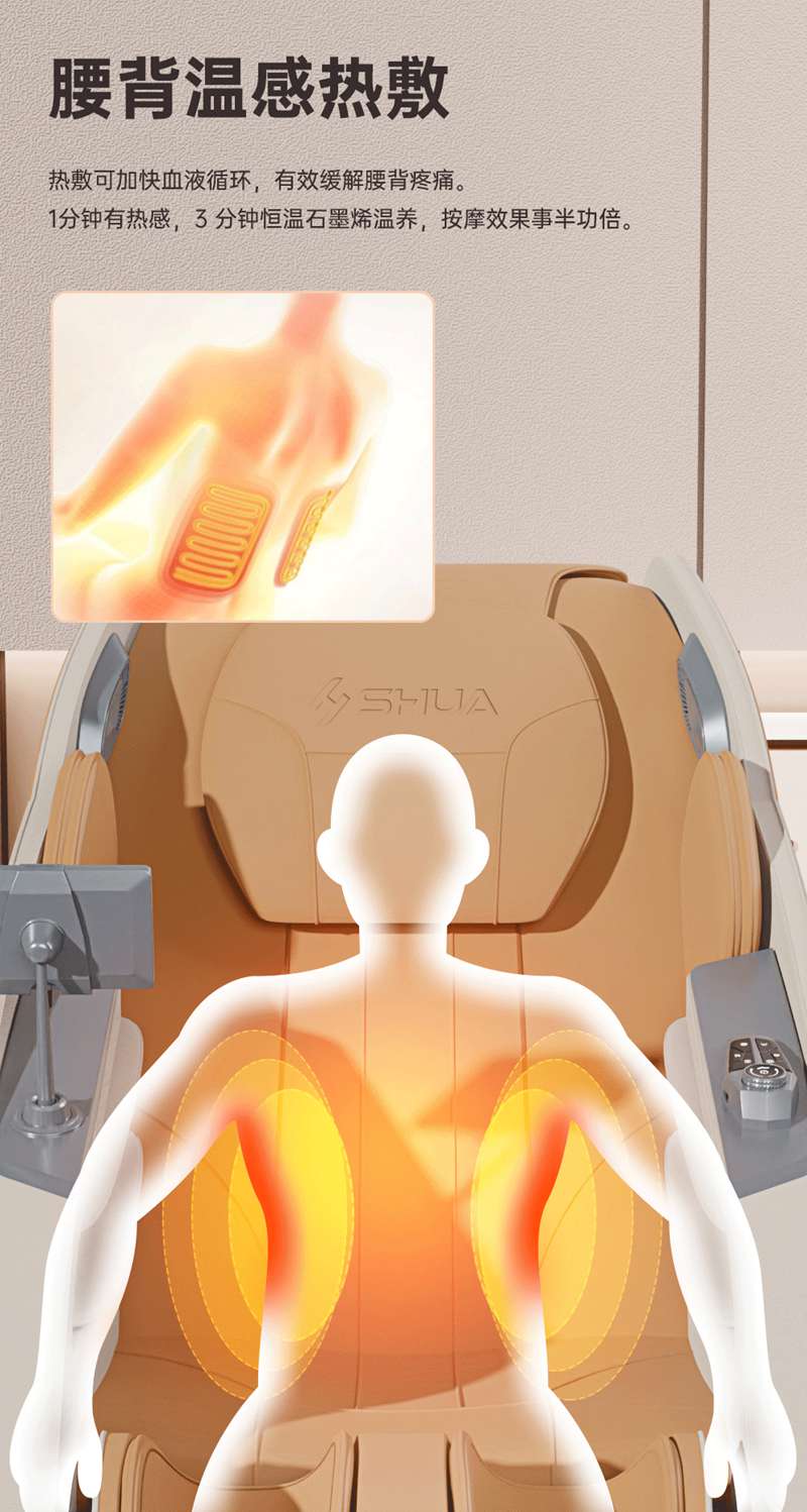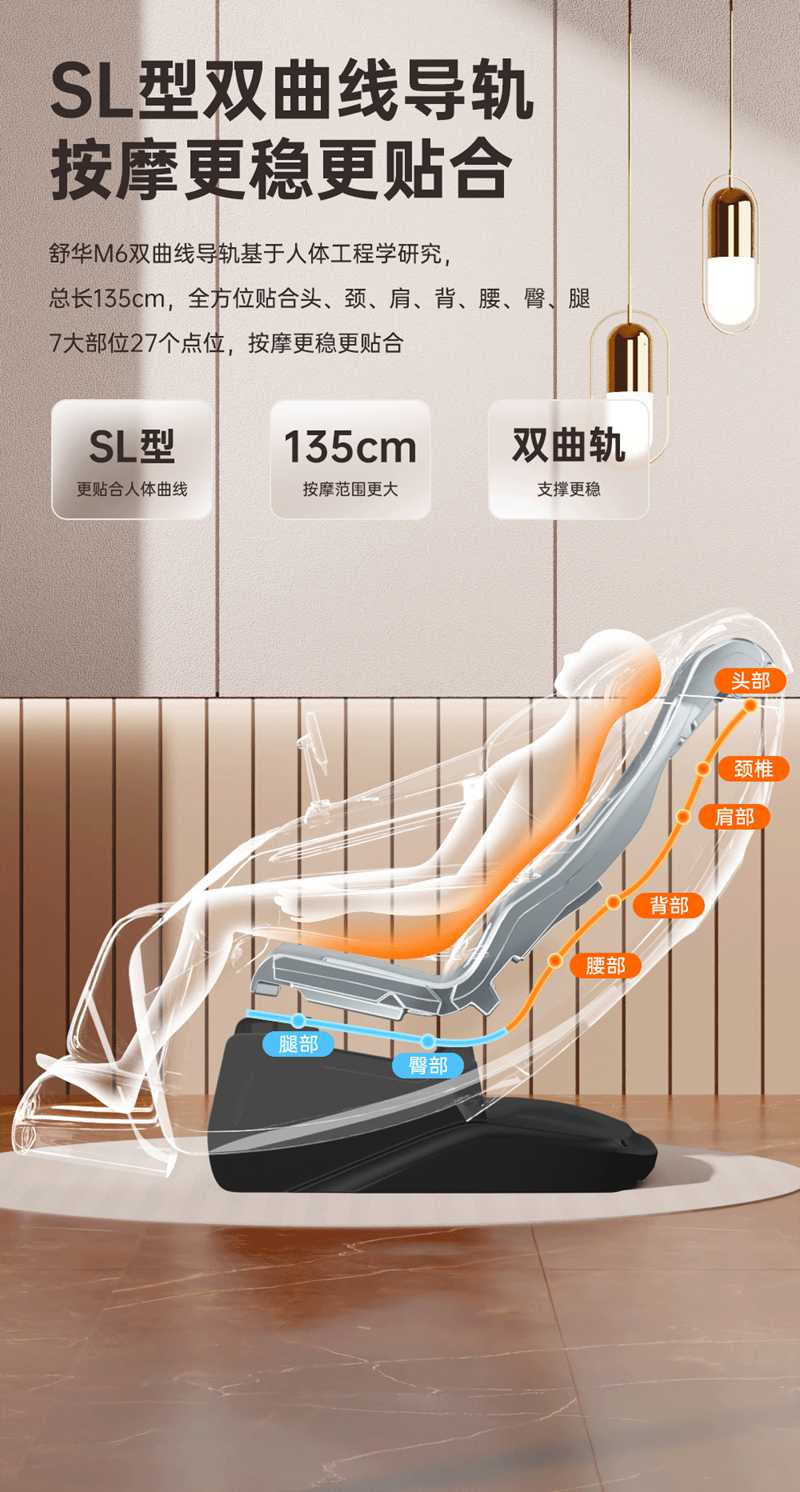 SH-M650 运动放松椅-4种运动放松特定程序,满足不同人群和场景下的需求,12种按摩程序,融合现代科技与传统按摩理念,提供精准力度和科学手法。定制135cmSL贴合7大部位27个点位,确保按摩全面深入,SL型导轨贴合人体背部曲线,提供精准舒适的按摩体验,双曲线导轨,高硬度,稳固不易变形。采用霍尔检测技术,通过多组传感器自动识别人体曲线和按摩点,机械手自动调节,适应不同身高体型,实现个性化按摩体验。