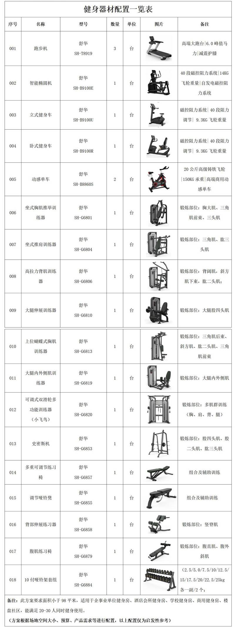 此方案要求面积小于98平米,适用于企事业单位健身房、酒店会所健身房、学校健身房、商用健身房、楼盘社区,能满足15-25人同时健身使用。(方案根据场地空间大小、预算、产品需求等进行配置,以下配置仅为启发性参考)