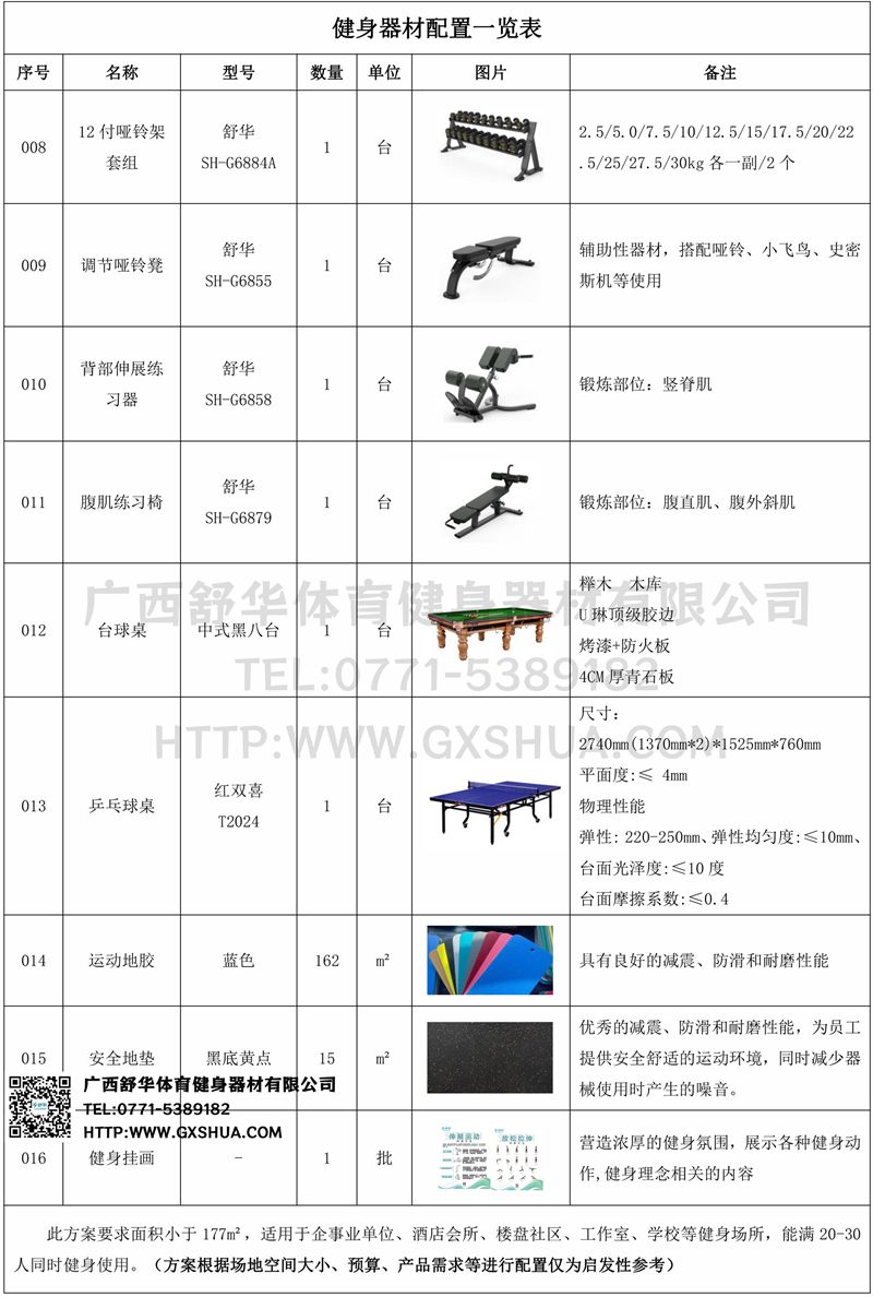 此方案要求面积小于177m²,适用于企事业单位、酒店会所、楼盘社区、工作室、学校等健身场所,能满20-30人同时健身使用。(方案根据场地空间大小、预算、产品需求等进行配置仅为启发性参考)