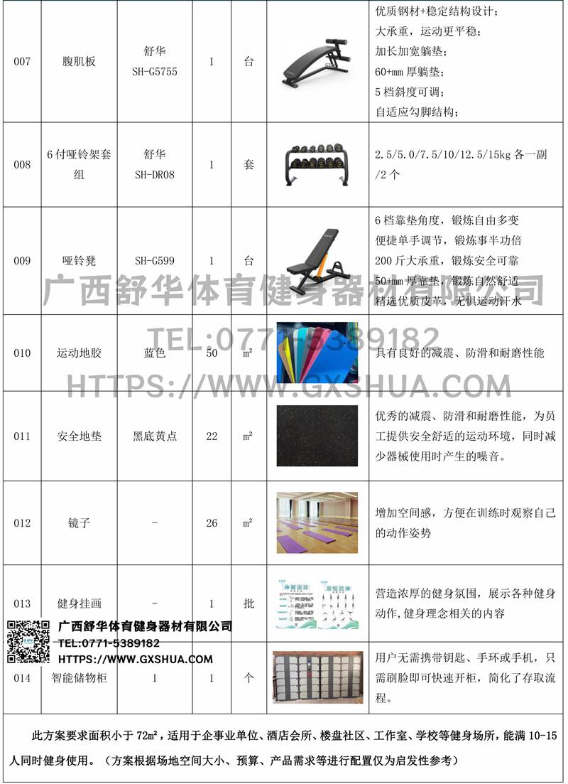此方案要求面积小于72m²,适用于企事业单位、酒店会所、楼盘社区、工作室、学校等健身场所,能满10-15人同时健身使用。(方案根据场地空间大小、预算、产品需求等进行配置仅为启发性参考)