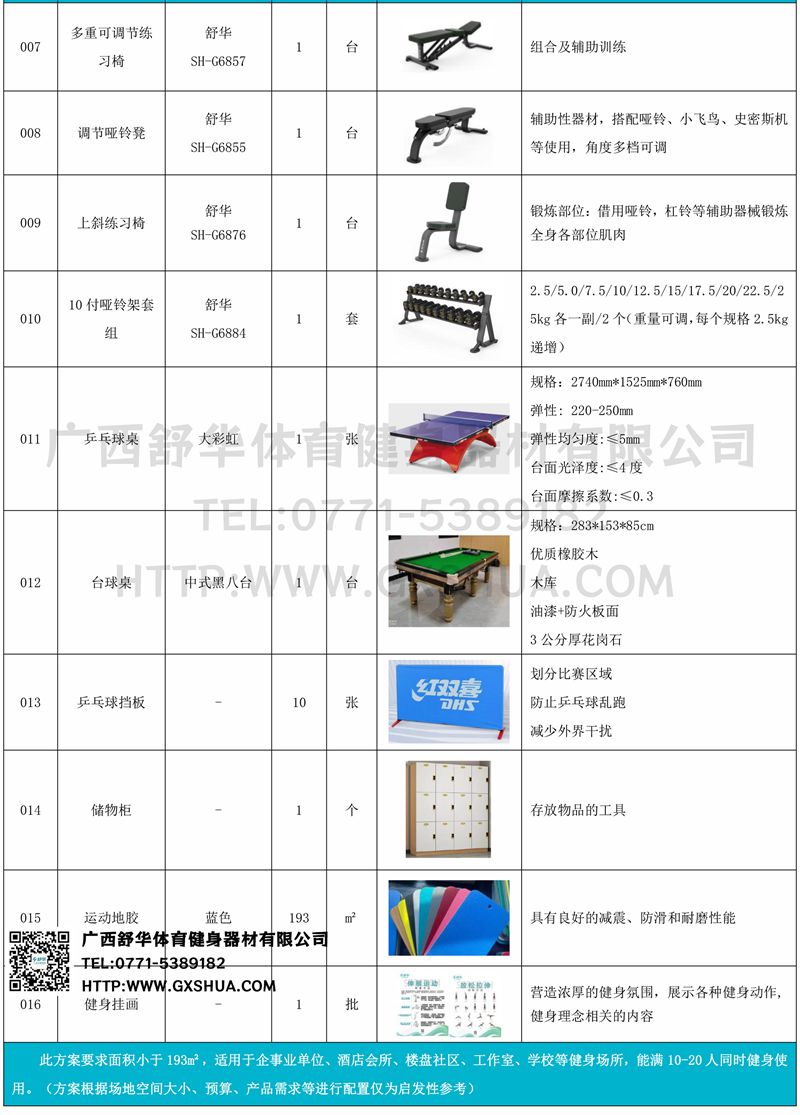 此方案要求面积小于193m²,适用于企事业单位、酒店会所、楼盘社区、工作室、学校等健身场所,能满10-20人同时健身使用。(方案根据场地空间大小、预算、产品需求等进行配置仅为启发性参考)
