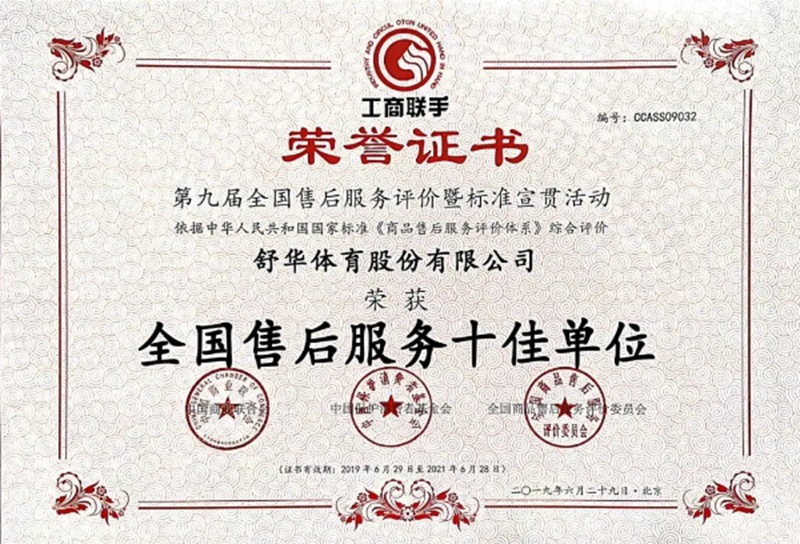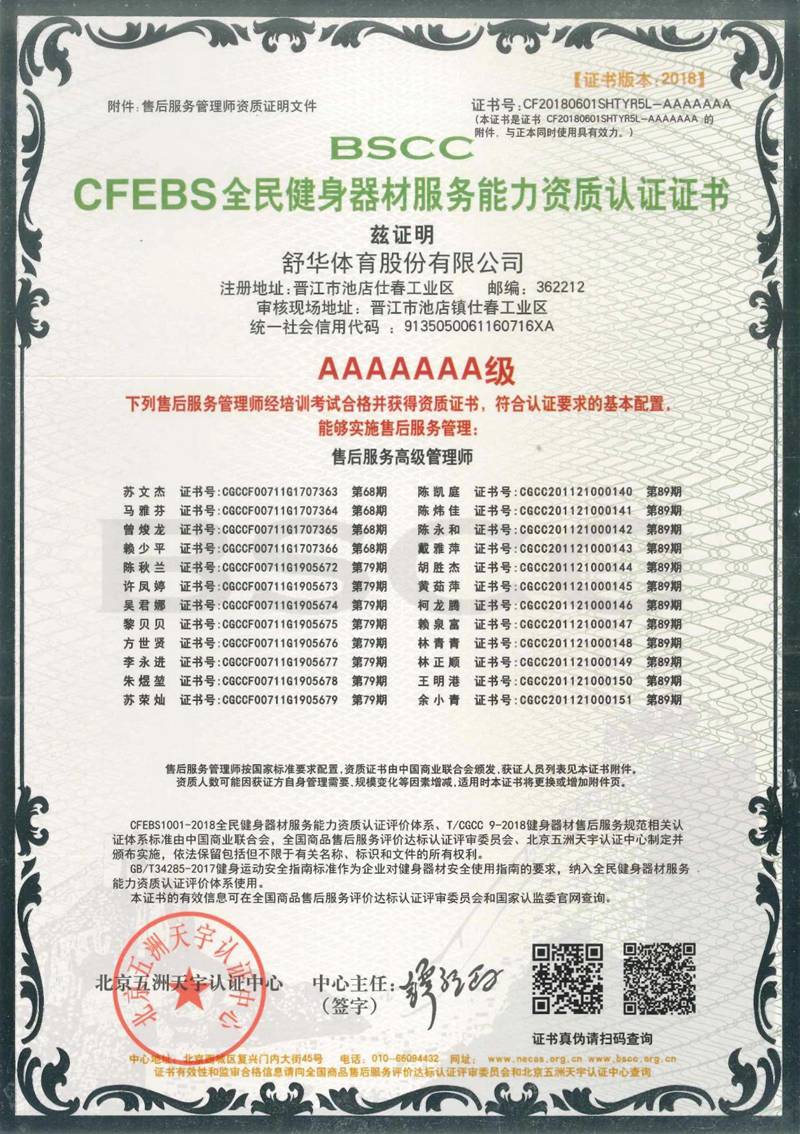 多宝电竞以用户满意作为服务追求,凭借专业的技术能力及服务保障能力、有效的售后服务体系,获得“BSCC-CFEBS 全民健身器材服务能力资质认证证书 AAAAAAA 级”,部分员工经培训考试合格并获得“BSCC-CFEBS 全民健身器材服务能力资质认证证书-售后服务高级管理师(AAAAAA 级)。