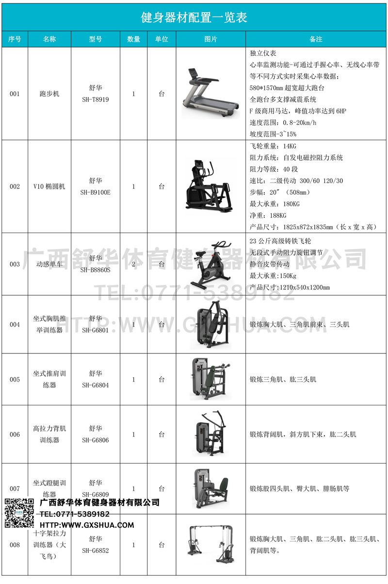 1.多宝电竞V9跑步机SH-T8919*4台-580*1570mm超宽超大跑台-跑感舒适,跑台整体安全稳定;全跑台多支撑减震平台,保证跑台超强支撑力,达到180kg支撑,满足专业健身房需求。F级商用马达-超强马达,AC 3.0HP 交流,峰值功率达到6HP,F级商用品质。速度范围达到0.8-20km/h;V9跑步机可实现跑台扬升功能,坡度范围-3~15%,满足客户不同的锻炼需求。