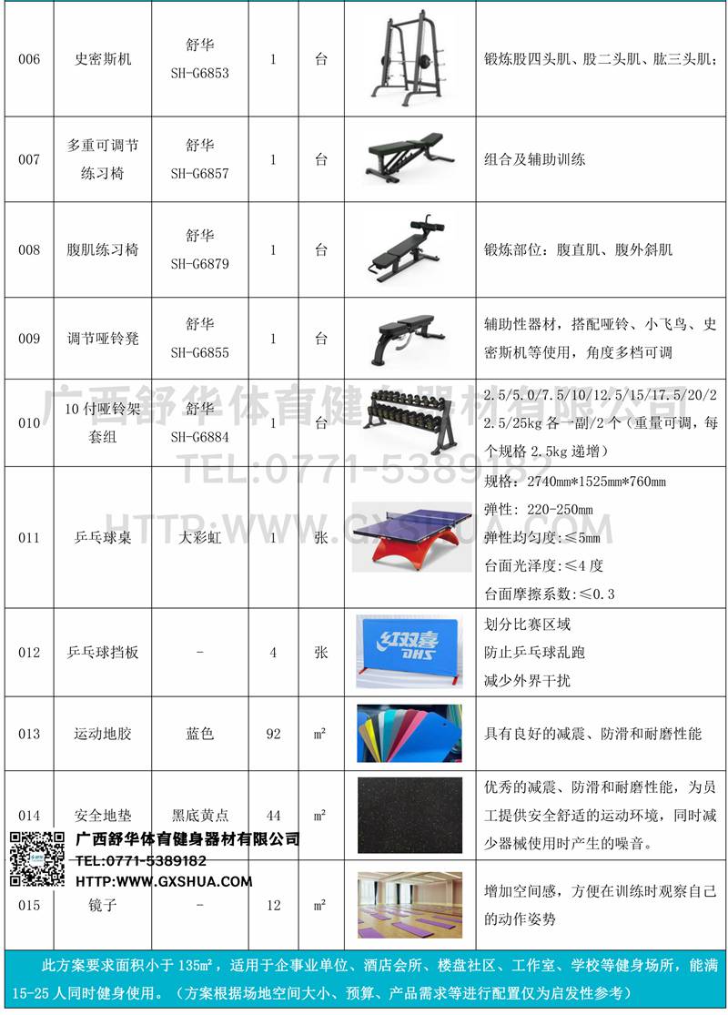 史密斯机1台)多重可调节练习椅1台)、腹肌板(1台)、10付哑铃套组(1套)、哑铃凳(1台)、可以实现对不同肌肉群的针对性训练,满足肌肉训练需求,全方位激活身体机能。